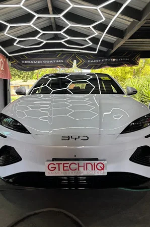 The owner wanted to preserve the paint’s clarity and reduce the need for constant washing. A ceramic coating was the perfect fit, offering long-term gloss retention, chemical resistance, and a slick surface that’s easier to clean. Our team recommended a Gtechniq professional-grade coating to give this BYD lasting shine and durability.